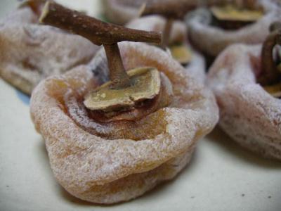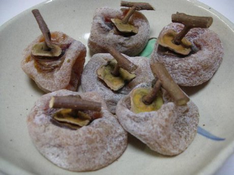 ちょっと硬くなった干し柿は番茶につけると、ふっくらと和菓子のようになって蘇ります。